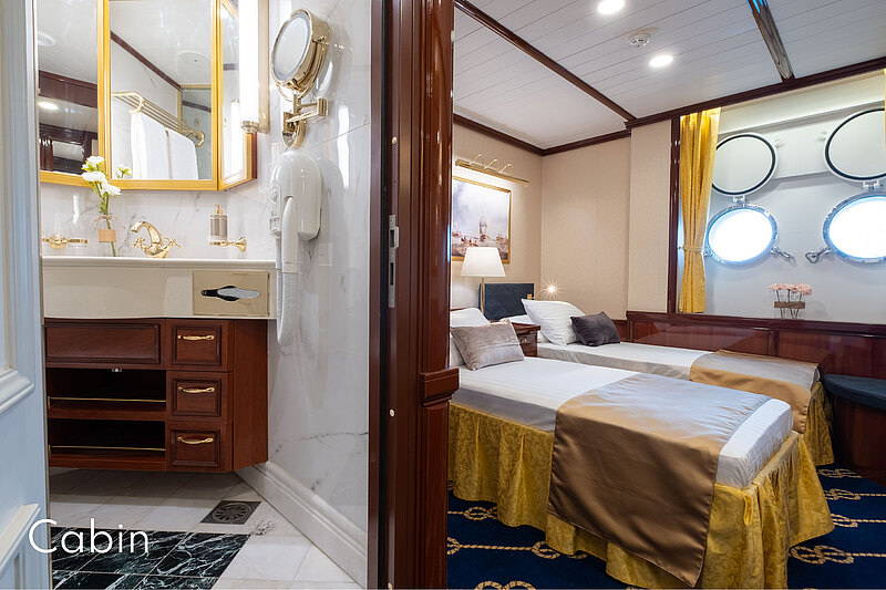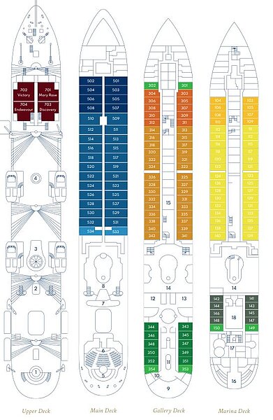 Alle Kabinen auf dem Gallery und Marina Deck beherbergen zwei Gäste. Zusätzlich stehen sechs ausgesprochene Einzelkabinen an Bord zur Verfügung, die ein einzelnes, großes Queen-Size Bett haben. Es liegt in der Natur eines Segelschiffs, dass hier und da Taue und Kabel, oder andere zum Fahrtbetrieb notwendige Ausrüstungsgegenstände, vor Ihrem Kabinenfenster auf dem Upper und Main Deck auftauchen und wieder verschwinden können.