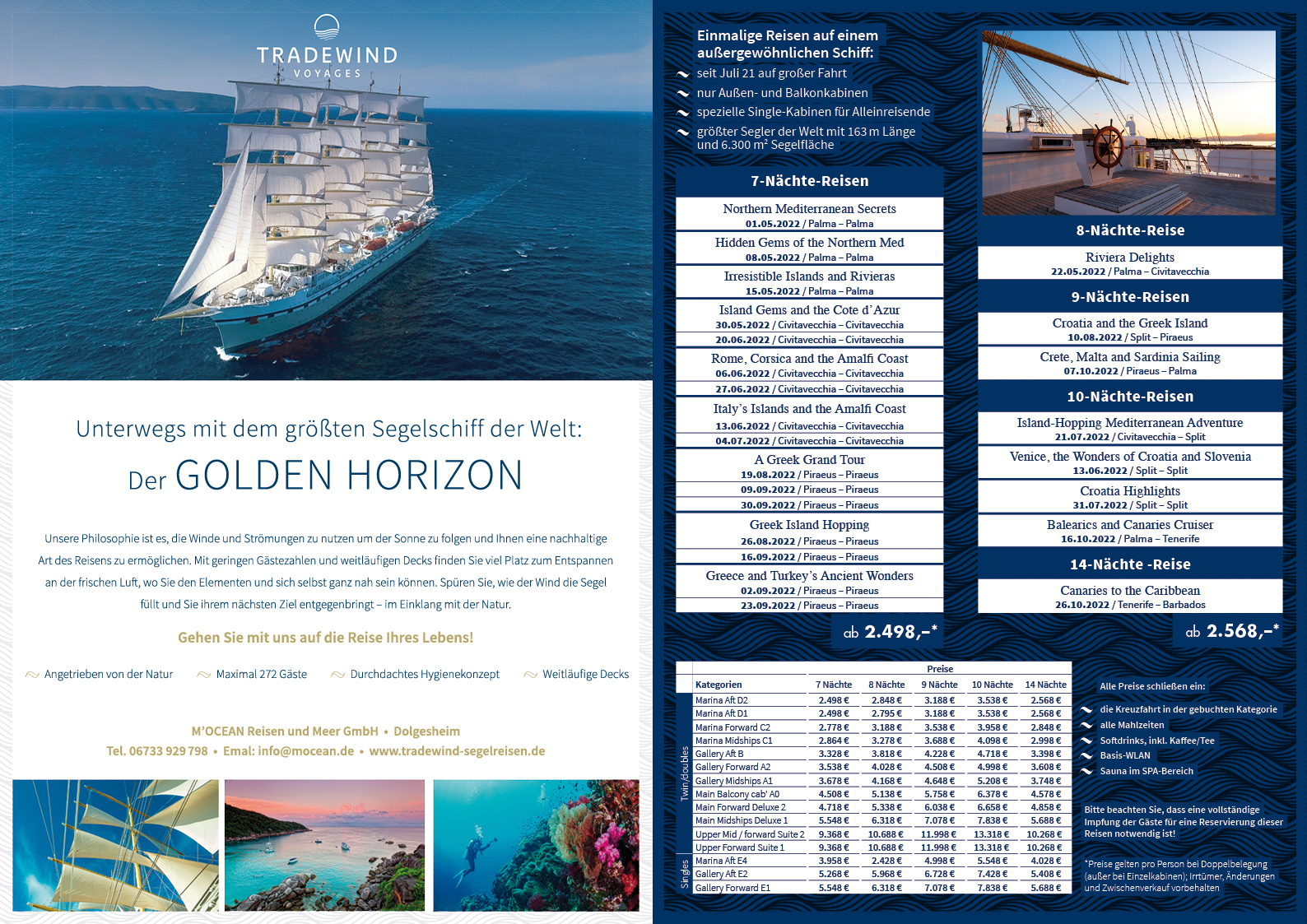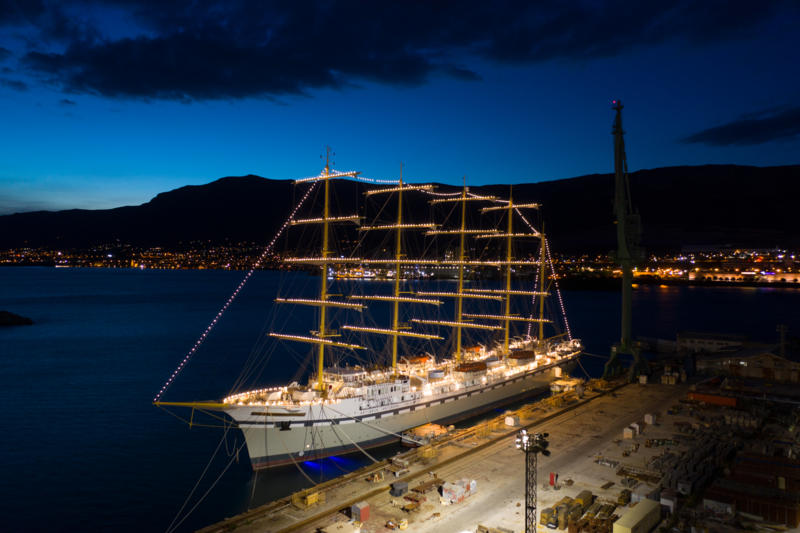 Das größte Segelschiff der Welt, die "GOLDEN HORIZON", ist der Stolz der neu gegründeten Reederei Tradewind Voyages. Ganz im Trend einer nachhaltigen Kreuzfahrt, wird sie zu 70% nur mit der Kraft des Windes in ihren Segeln fortbewegt und folgt dabei den natürlichen Meeres-Strömungen sowie den Handelswinden über den Globus (daher auch der Name Tradewind Voyages). Ursprünglich als "Flying Clipper" für Star Clippers gebaut, tritt sie im Mai 2021 ihre Jungfernreise an.